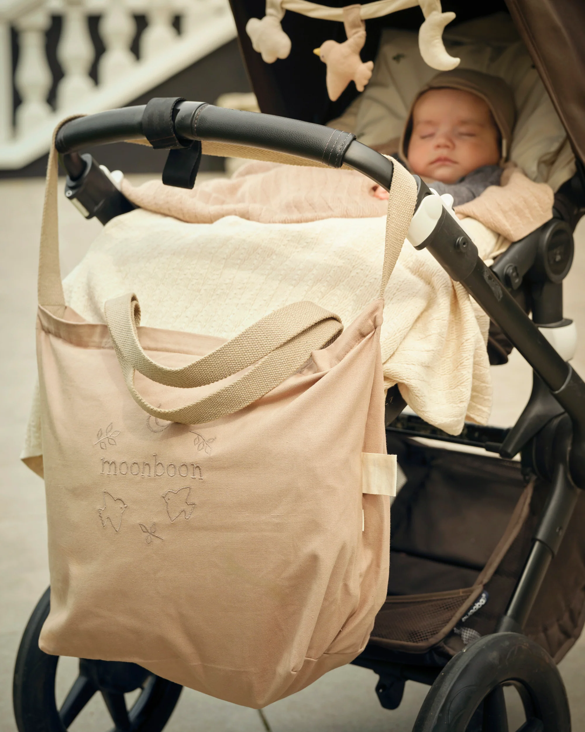Our canvas diaper tote bag combines style and functionality, featuring a spacious interior, three internal pockets for easy organization, and sturdy handles—perfect for parents on the go.